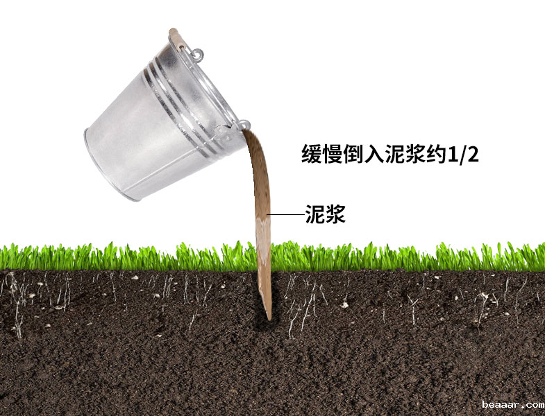 6. 将泥浆慢慢倒入孔洞,大概到孔洞1/2的位置;可根据实际情况酌情增减。